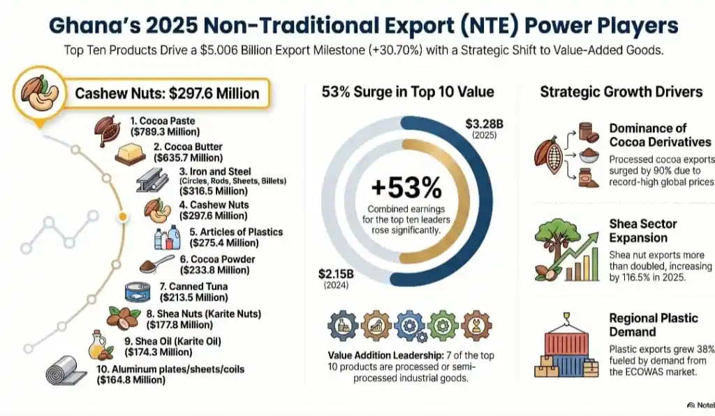 While cocoa anchored the rankings, other agricultural commodities also demonstrated significant resilience. Cashew nuts contributed $297.6 million (GH₵3.29 billion) to the economy, marking a 10.15% increase. Simultaneously, the shea sector saw a massive spike in performance; shea nuts recorded a growth of 116.51% to reach $177.8 million (GH₵1.97 billion), while shea oil exports rose 15.43% to $174.3 million (GH₵1.93 billion). This growth is sustained by the pharmaceutical and cosmetic industries’ increasing preference for natural ingredients.