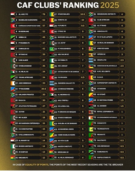 The rankings were put together over the course of five years with performance in the CAF Champions League and CAF Confederation Cup heavily determining clubs position in the rankings.