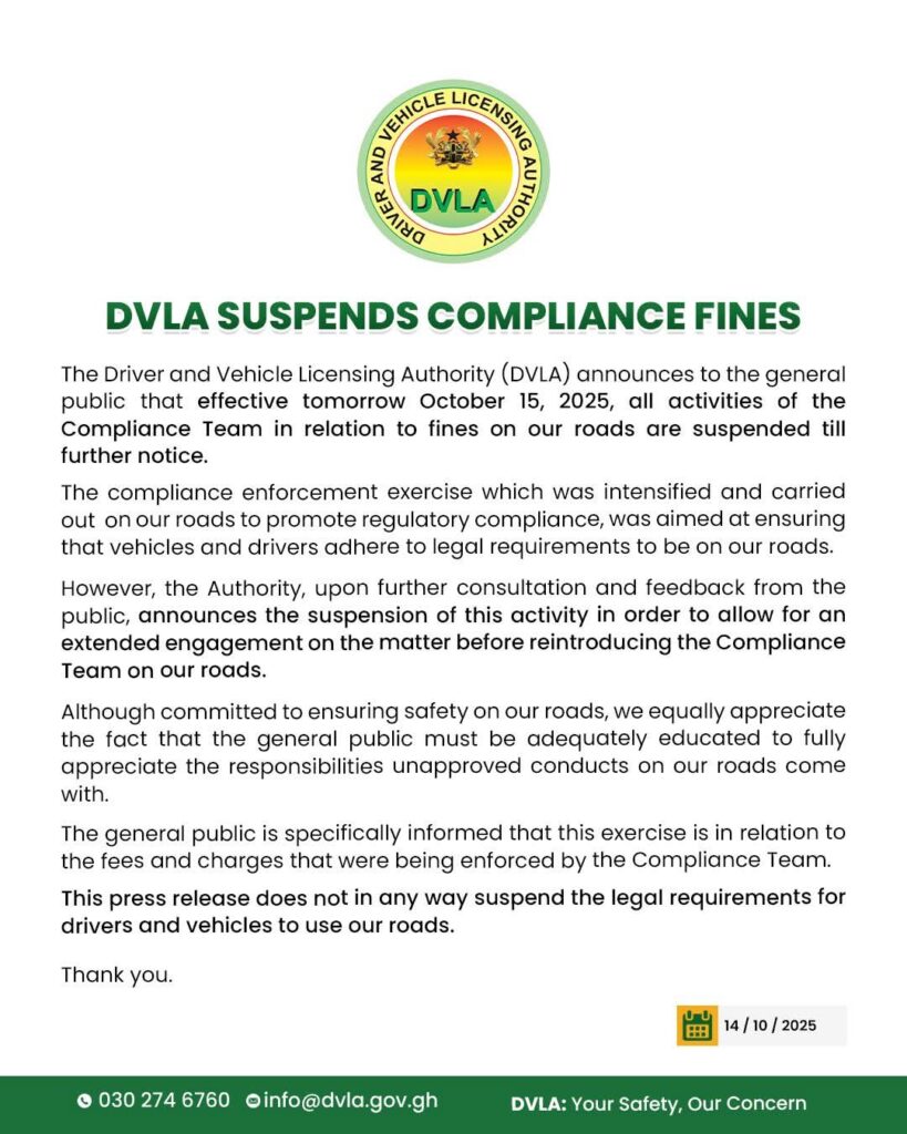 The Driver and Vehicle Licensing Authority (DVLA) has announced the suspension of all fines issued by its Compliance Team on roads across Ghana, effective October 15, 2025. This decision comes after weeks of intensified enforcement aimed at ensuring drivers and vehicles meet all legal and regulatory requirements.