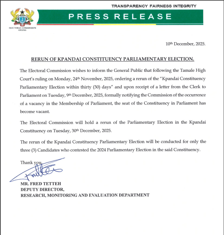 The Electoral Commission (EC) has announced that the rerun election for the Kpandai constituency will take place on December 30, 2025. The decision follows a ruling by the Tamale High Court on Monday, 24th November 2025, which ordered a rerun of the election within thirty days.