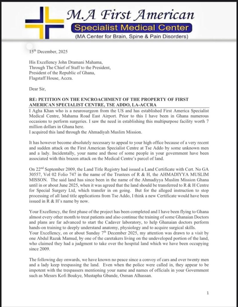 The press conference follows a petition dated December 15, 2025, addressed to President John Dramani Mahama by Dr Agha Shahid Khan, a US-based neurosurgeon and founder of the First American Specialist Medical Centre at Tse Addo.