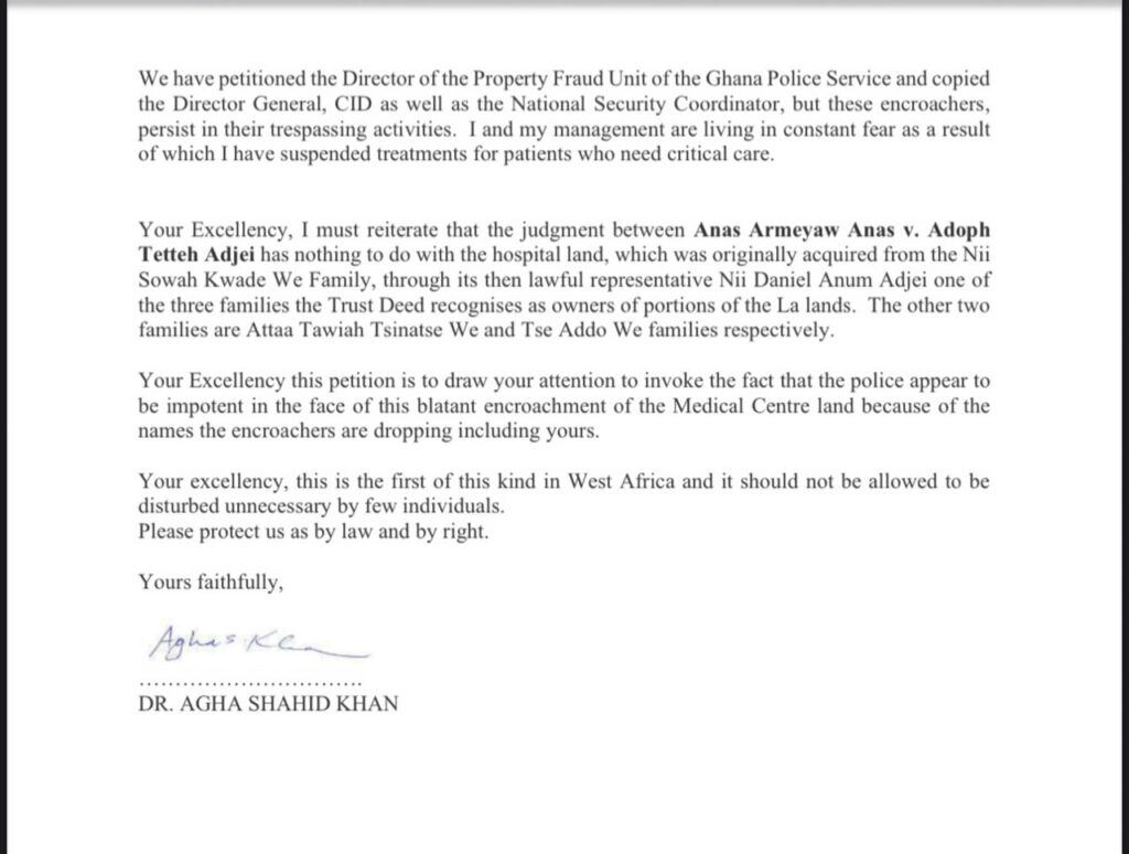 In the petition, Dr Khan alleged that his $7 million medical facility had come under attack by unknown individuals who claimed to be acting on the basis of a court judgment. He stated that the land on which the hospital sits was acquired in 2009 through the Ahmadiyya Muslim Mission and is covered by Land Certificate Number GA 30557.