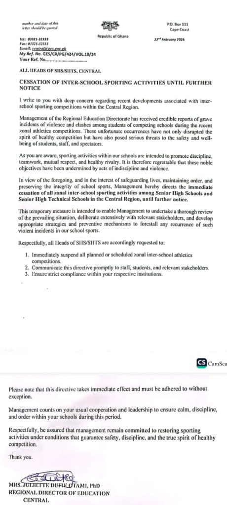 The Central Regional Directorate of the Ghana Education Service has ordered an immediate suspension of all zonal inter‑school sporting activities for Senior High Schools and Senior High Technical Schools across the region.