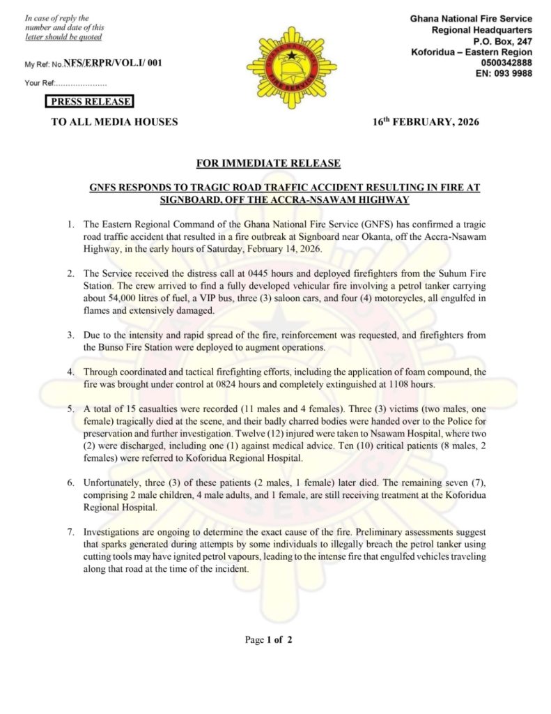 Six people have died following a tragic fire incident involving a petrol tanker and multiple vehicles on the Accra-Nsawam Highway near Okanta in the early hours of Saturday, February 14, 2026.