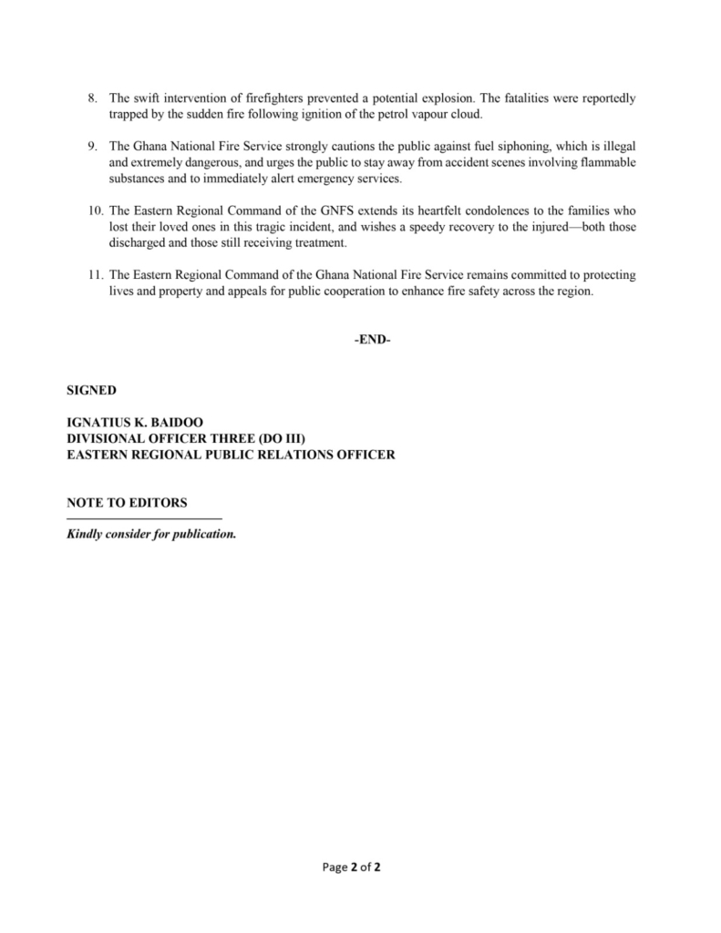 Preliminary investigations suggest the fire may have been caused by sparks generated during illegal fuel siphoning attempts. “Preliminary assessments suggest that sparks generated during attempts by some individuals to illegally breach the petrol tanker using cutting tools may have ignited petrol vapours, leading to the intense fire,” the GNFS stated.