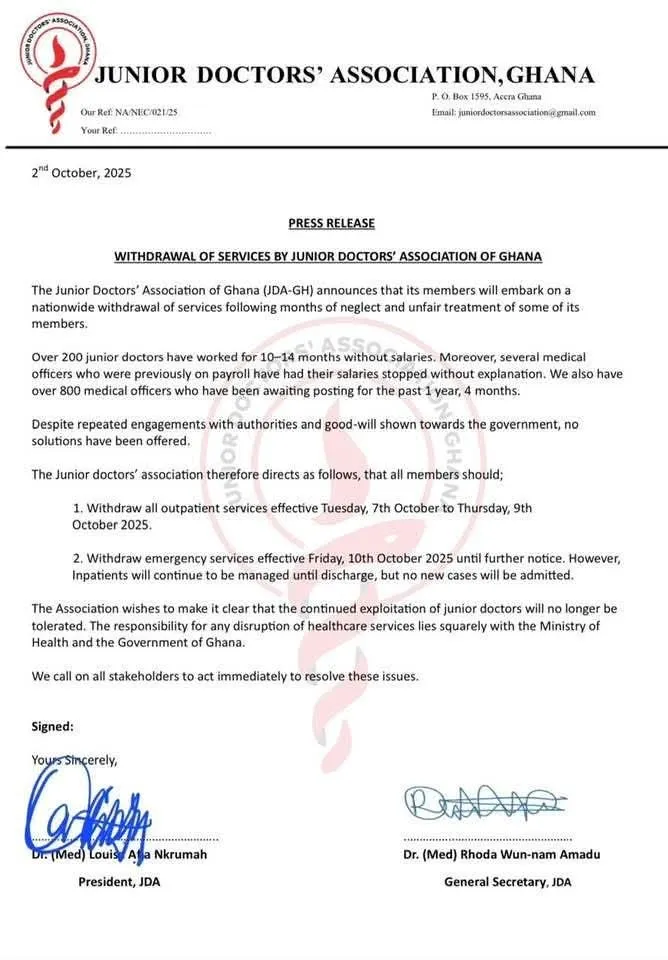 The Junior Doctors’ Association of Ghana (JDA-GH) has announced plans to withdraw its services nationwide starting October 7, 2025, citing prolonged neglect and unfair treatment. According to the association, over 200 junior doctors have reportedly worked for 10 to 14 months without pay, while others have had their salaries stopped without explanation. Additionally, more than 800 medical officers have been awaiting posting for over a year.