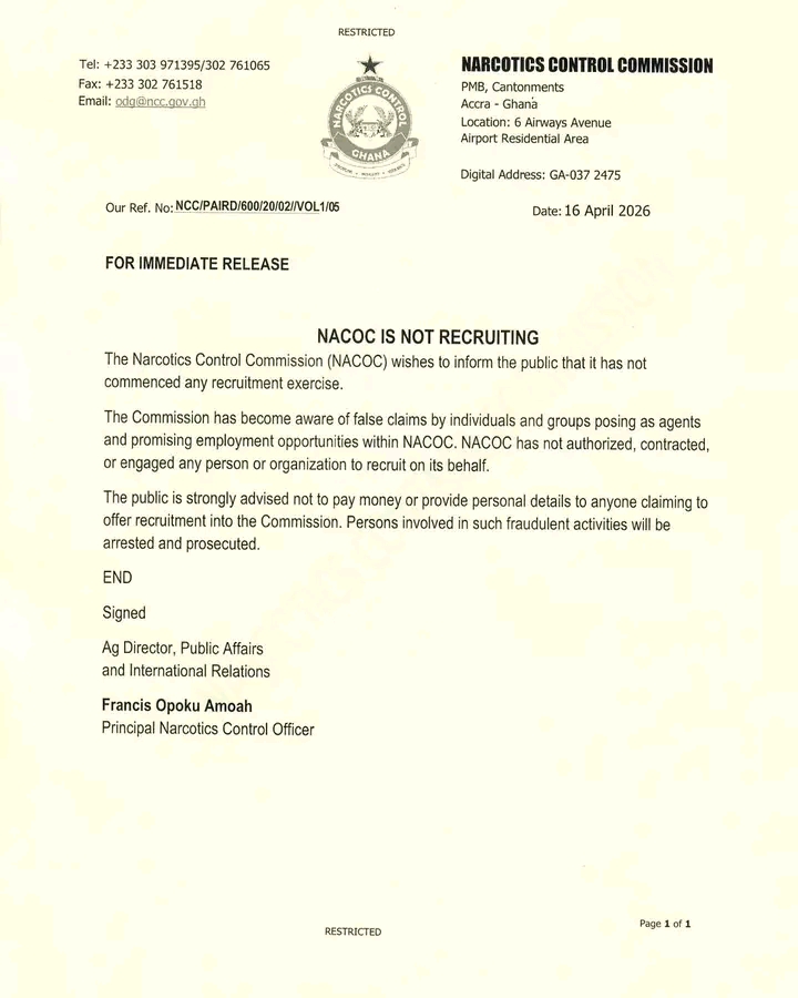 The Narcotics Control Commission (NACOC) has issued a public warning over fraudulent recruitment schemes being circulated by individuals posing as agents of the Commission.