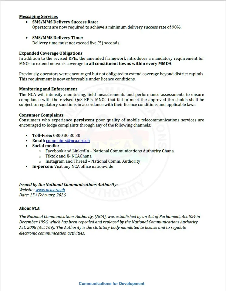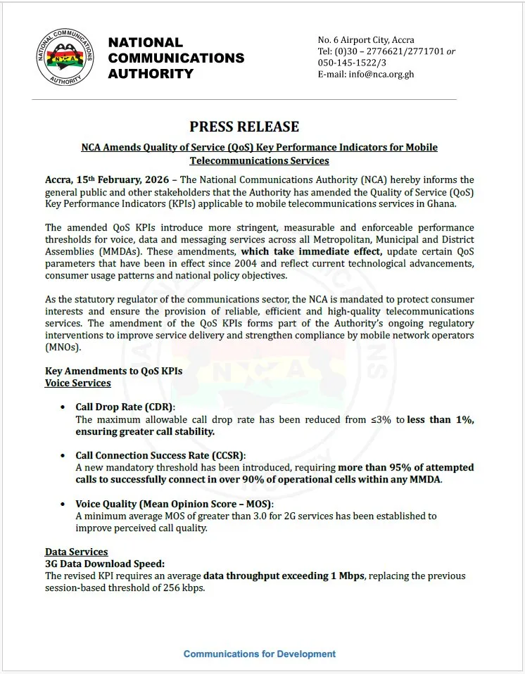 In a press statement released on Sunday, February 15, 2026, the NCA announced that it has amended the Quality of Service (QoS) Key Performance Indicators (KPIs) for mobile telecommunications services in Ghana, introducing “more stringent, measurable and enforceable performance thresholds” for voice, data and messaging services across all MMDAs.