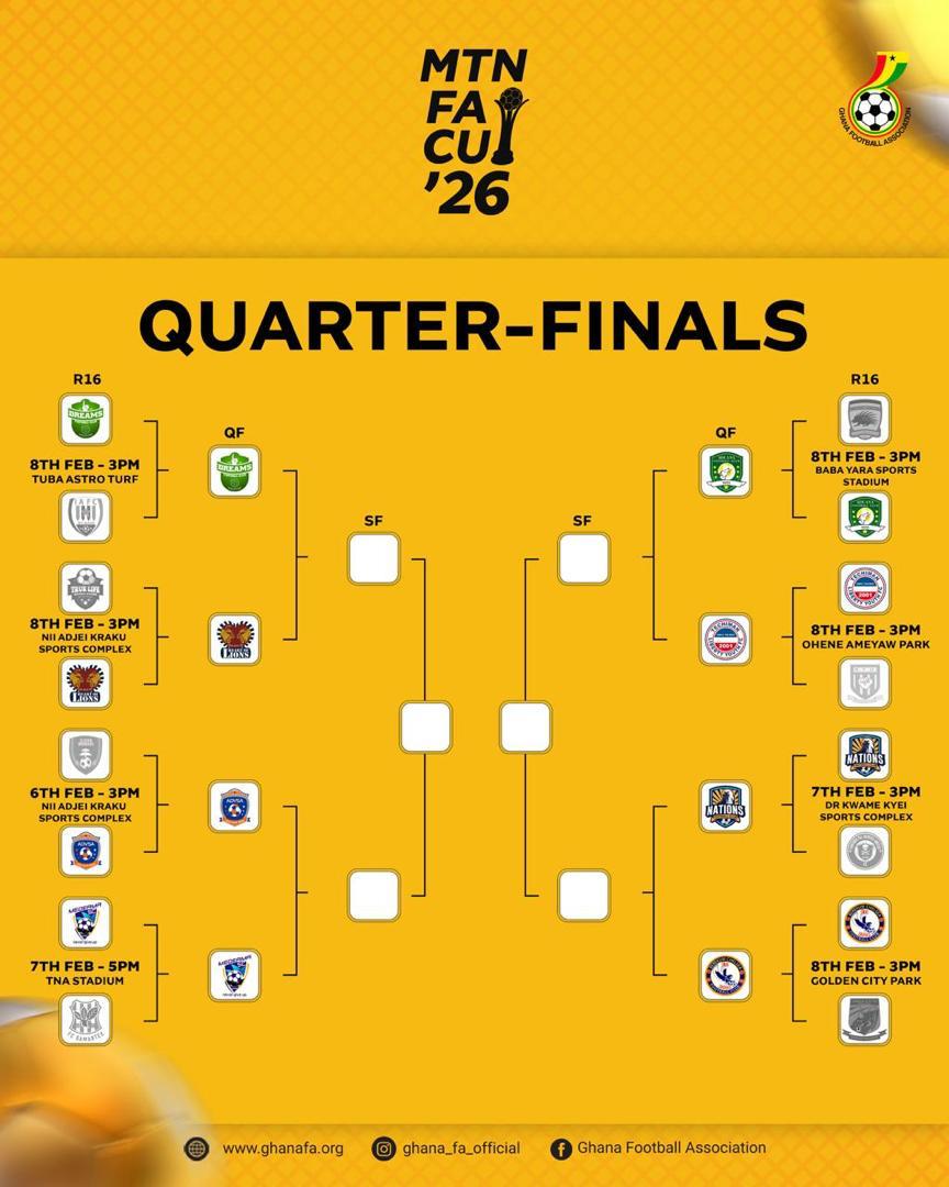 The eight quarter-finalists will play their matches at the Cape Coast Stadium and the Nana Fosu Gyeabour Park in Bechem on the weekend of March 13-16, 2026.