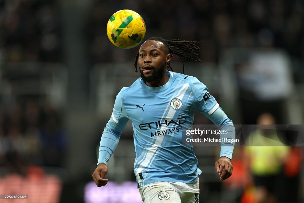 Antoine Semenyo of Manchester City on the ball during the Carabao Cup Semi Final First Leg match between Newcastle United and Manchester City (Photo by Michael Regan/Getty Images)