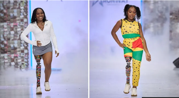 Walking the runway with her prosthetic leg wrapped in a colourful African print her appearance made a big impact.